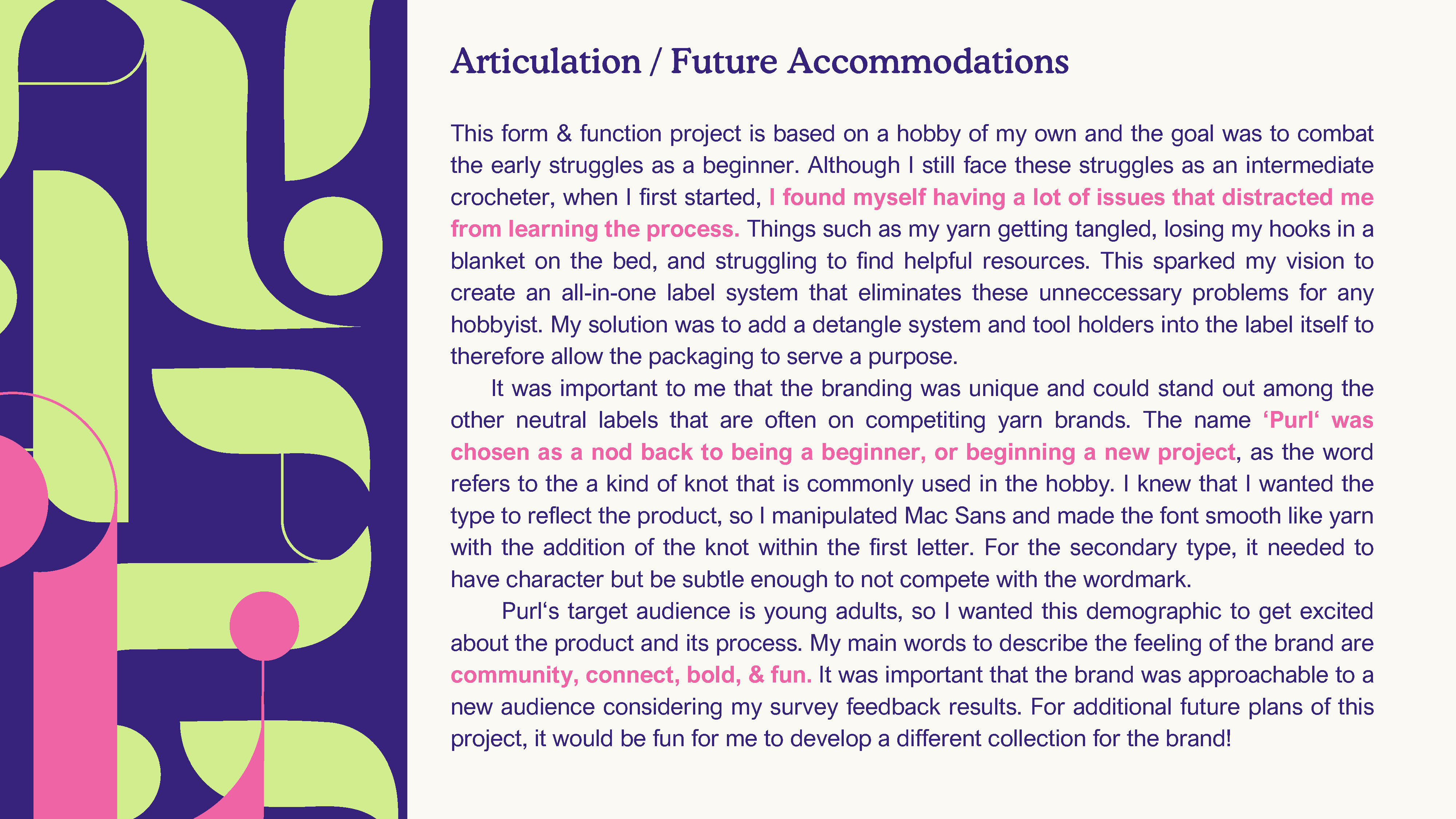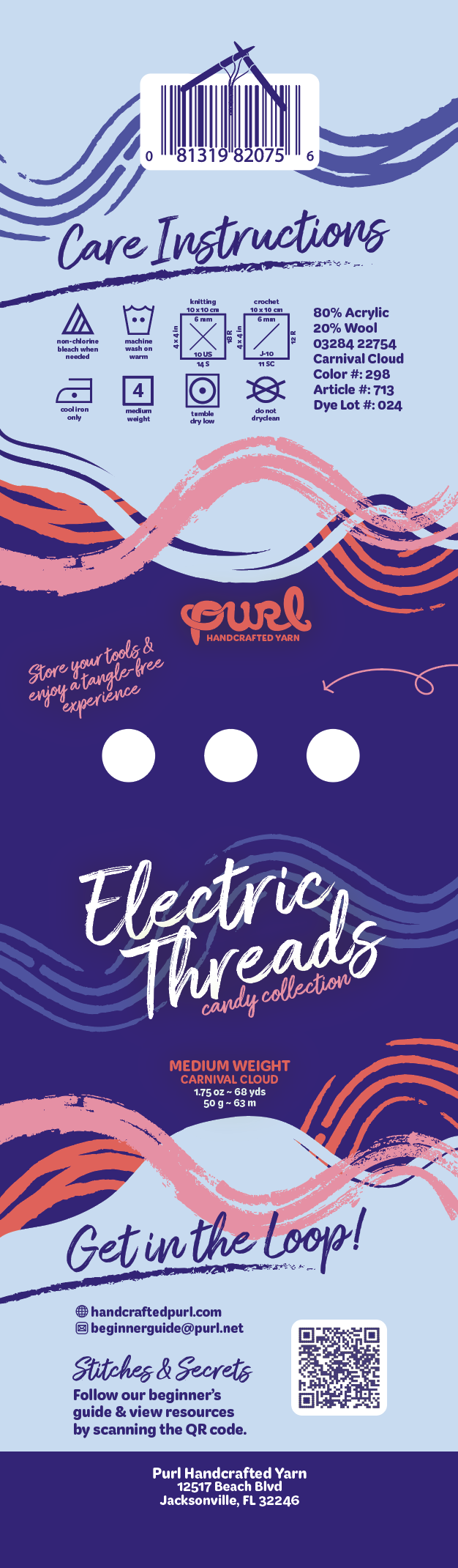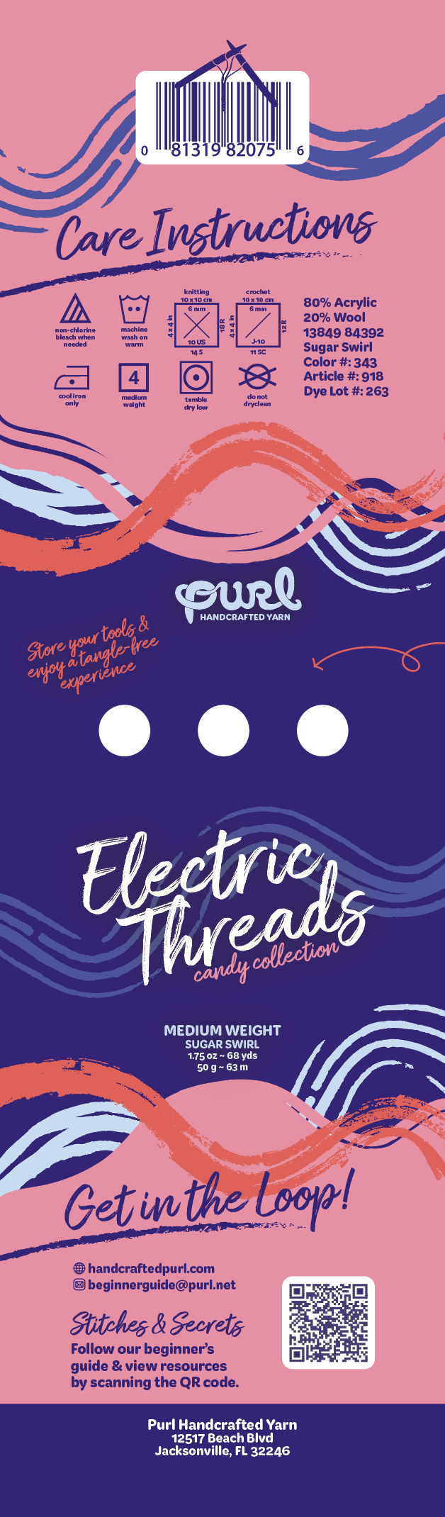 ‘Purl’ is the term for starting a new project as a crocheter. The concept is inspired by solving design flaws that are common with traditional yarn packging. This unique label concept with built-in tool holders and a simple detangling system provides a creative solution.